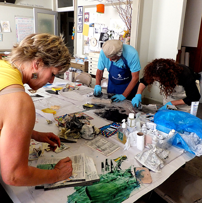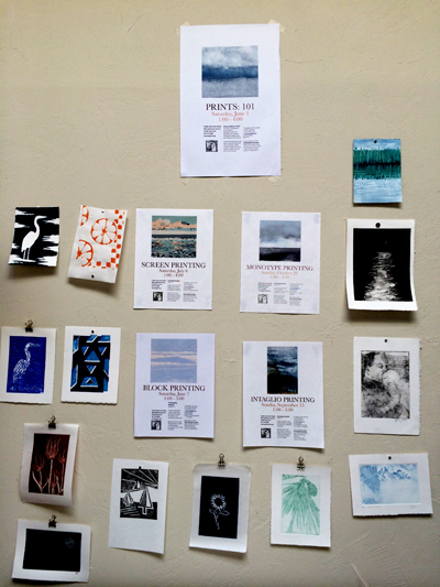 Single afternoon workshops are offered to discover the separate processes of relief (block), intaglio (drypoint), planographic (monoprint or lithograph) or screen printing. By creating a small print or greeting card the novice will learn the steps to complete an image. Materials are provided and no previous art experience necessary. All you have to bring is the curiosity and willingness to experiment!